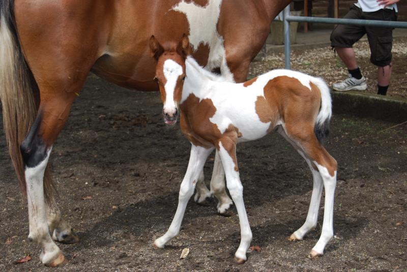 We are excited with the birth of our newest paint foal, Milagro. Her mother, La Joya is owned by Jen Dalton one of our best riding friends and guide and Squanto our stallion is the father. We called her our little miracle because she was the surviving Twin. We had had two ultrasounds done but didn't know La Joya was having twins, we thought she was just huge. As often happens with a surviving twin, the foal was a little girl. Her brother, who couldn't make it, was full term as well. We were saddened by his loss, but knew it was a miracle that the mother and one of the pair survived. Esteban had never seen a surviving twin in this area of Costa Rica. Everyone agreed that she should be named Milagro (miracle in Spanish. We imprinted her at 3 hours old.